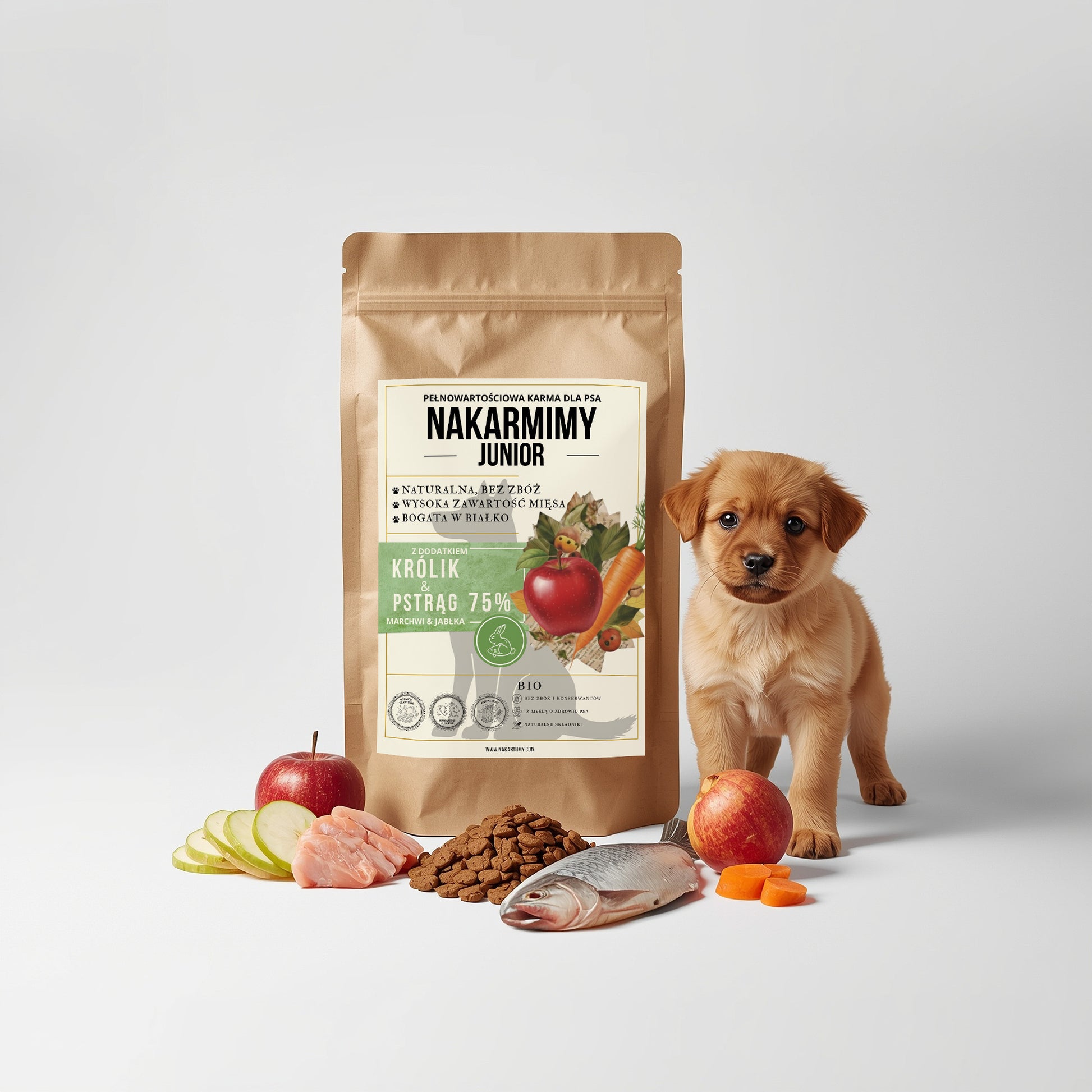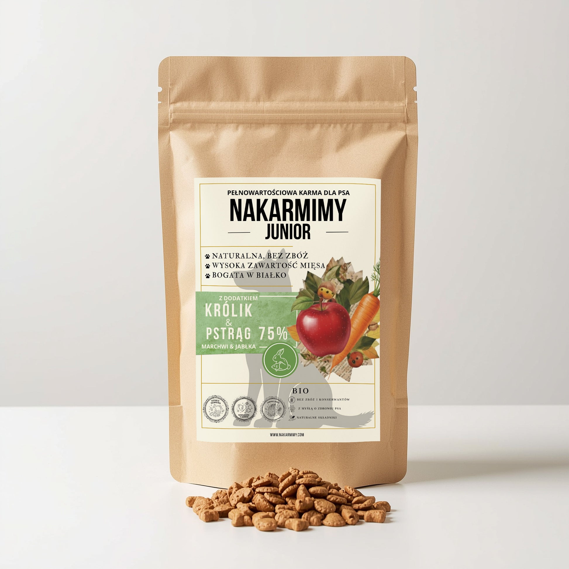 Karma sucha Pies Junior NAKARMIMY – Królik i Pstrąg 75% Jabłko i Marchew
